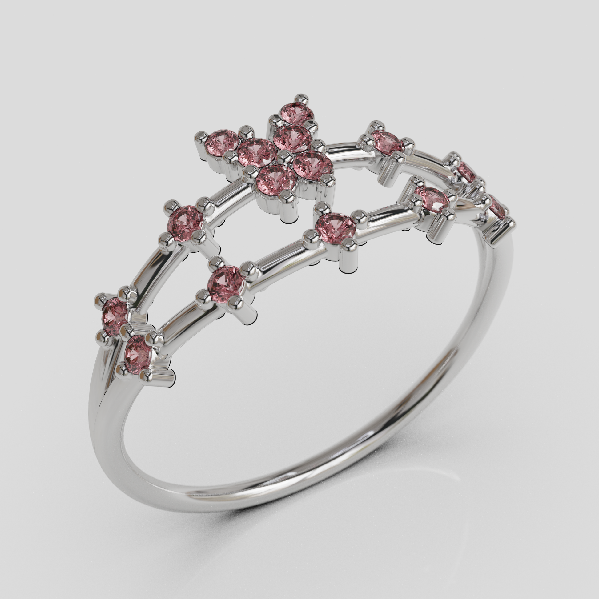 La composición del anillo crea una estética ligera y armoniosa donde las piedras se distribuyen cuidadosamente a lo largo del aro, generando un efecto luminoso y elegante. La mariposa central simboliza transformación, libertad y renovación, convirtiendo esta pieza en una joya llena de significado.