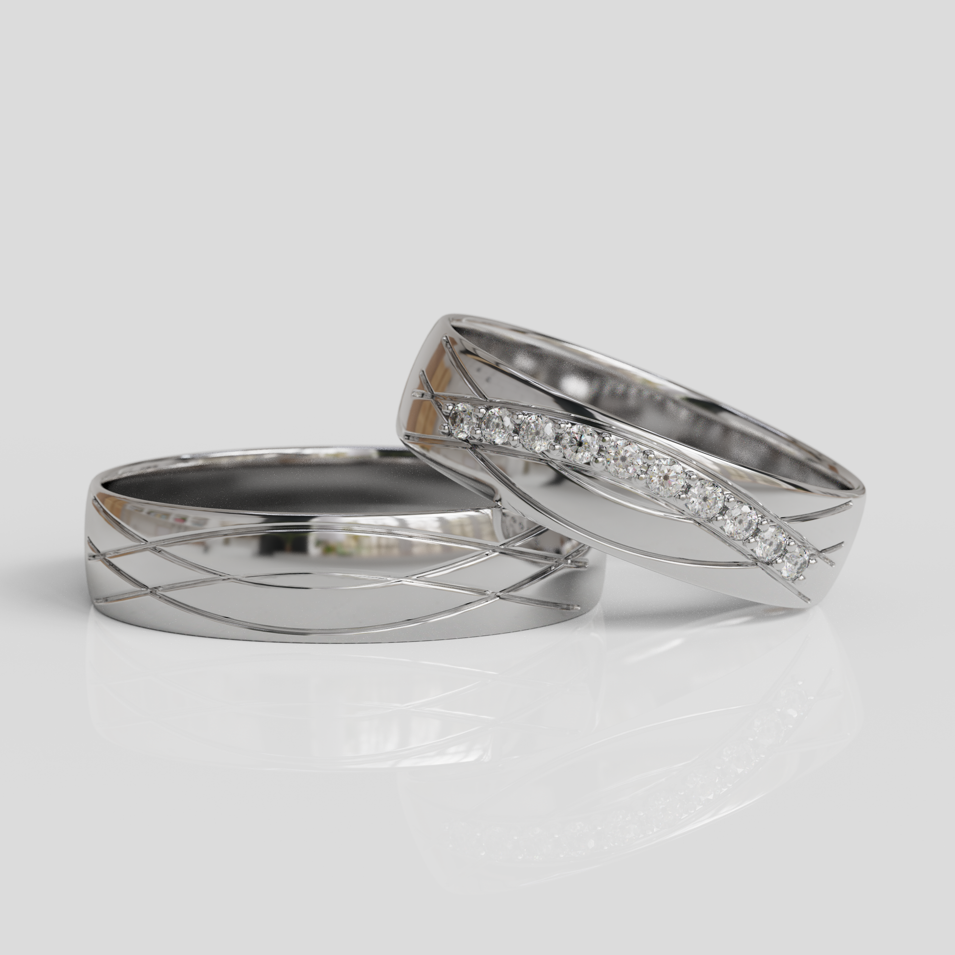Una argolla incorpora un canal de piedras brillantes engastadas que aporta luz y distinción, mientras la otra presenta un acabado texturizado que resalta su diseño moderno. Fabricadas en oro 18k, son ideales como argollas de matrimonio, alianzas de oro para pareja o anillos de compromiso, pensadas para quienes buscan exclusividad, calidad y una inversión duradera.