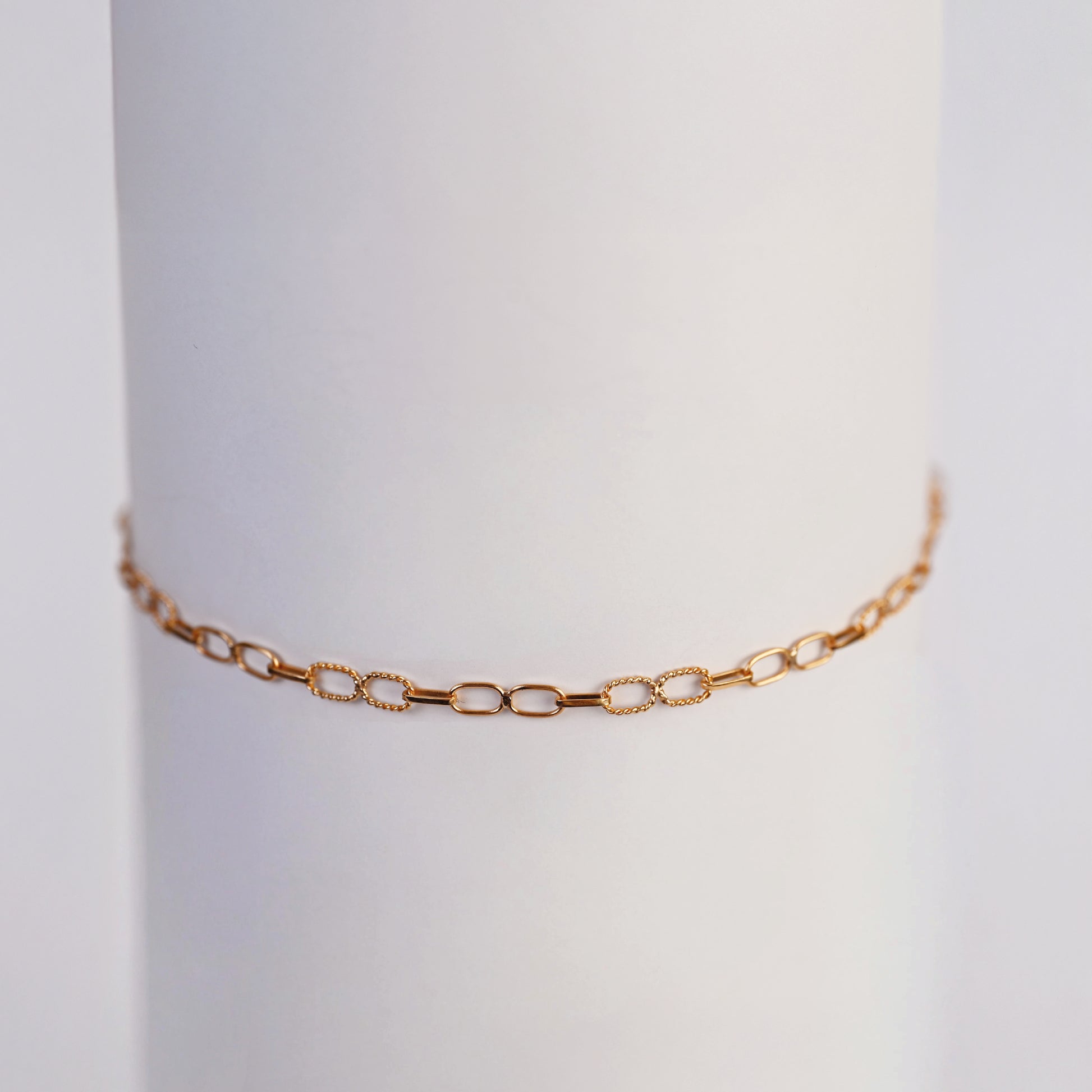 Esta delicada pulsera de oro presenta un diseño de eslabones largos y ovalados que se alternan con pequeños grupos de eslabones redondos, algunos de los cuales parecen tener un acabado texturizado o facetado para capturar la luz.