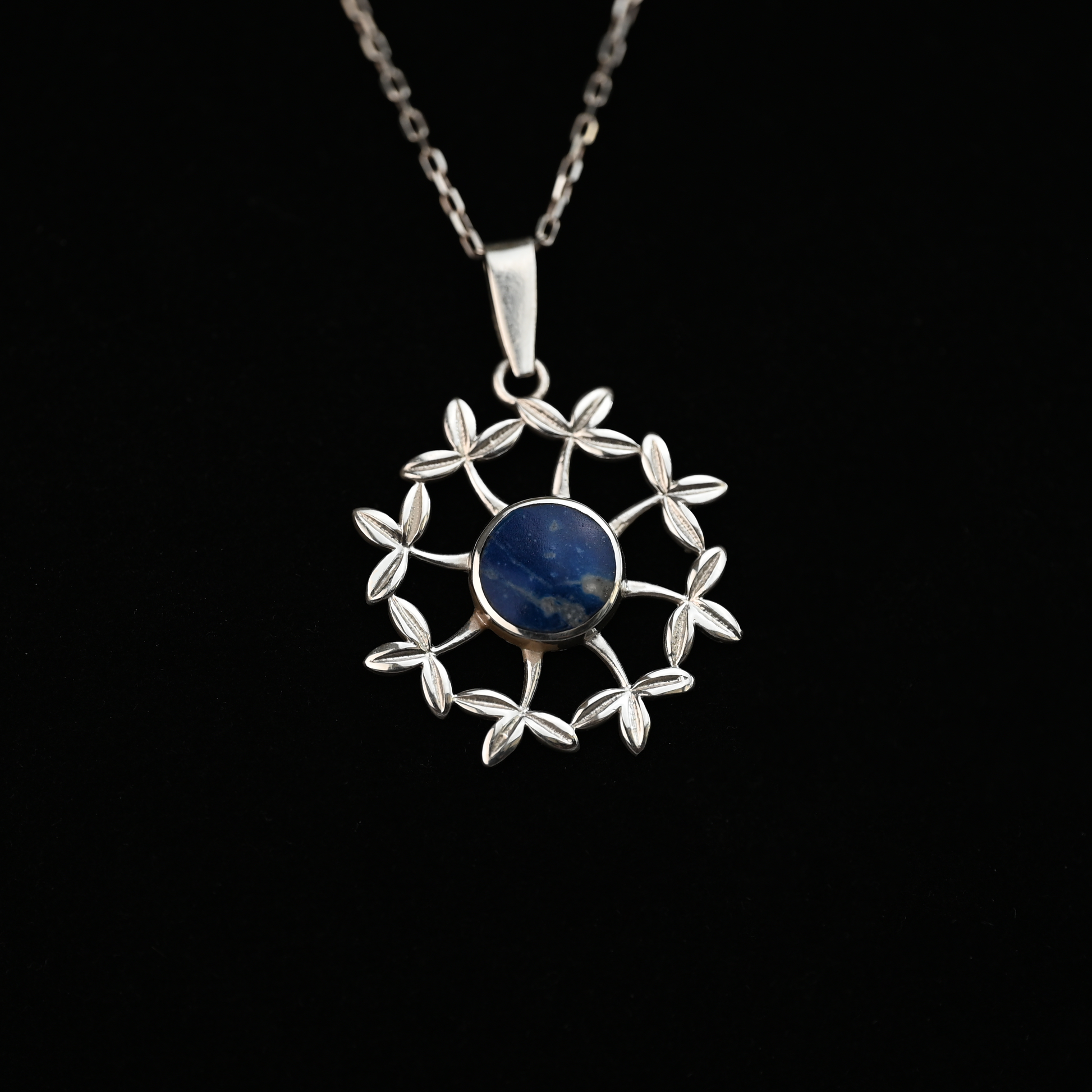 Inspirado en el crecimiento y la renovación, este colgante de plata con lapislázuli es ideal para quienes buscan un accesorio con significado y presencia sutil. La piedra central aporta contraste y profundidad, mientras que el trabajo en plata realza cada detalle del diseño floral.