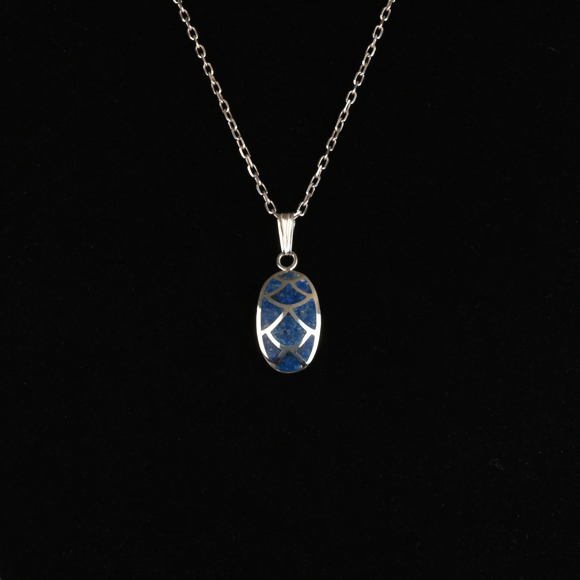 Fabricado en plata, su estructura resalta la intensidad del lapislázuli natural, una piedra reconocida por su profundo color azul y sus vetas únicas. Cada dije posee variaciones propias de la piedra, lo que garantiza una joya auténtica y especial.